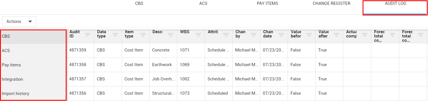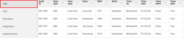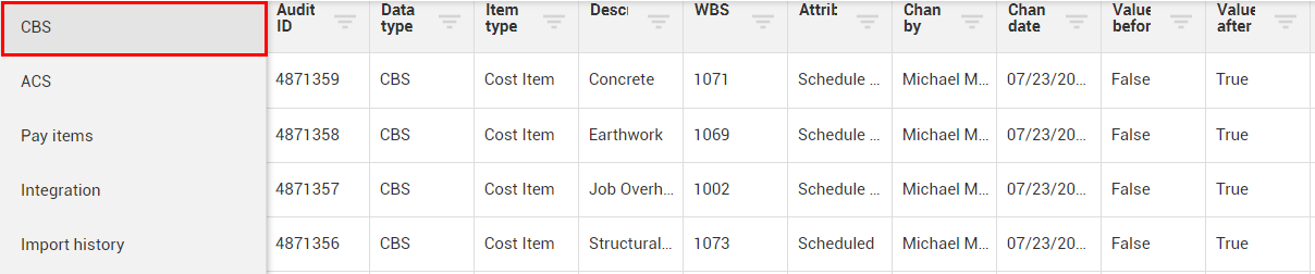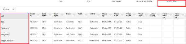 The Audit Log tab within the CBS register is used to capture changes that were made within InEight Control and is broken down into five sub-tabs located on a left sidebar menu. Each log is designed to capture the changes that happened within each of the different registers and during synchronization.