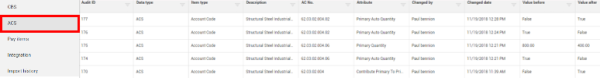 The ACS Audit Log functions similarly to the CBS Audit Log, but contains the changes that were made within the ACS (Account Code Structure) tab. The fields utilized to capture what changes were made are: