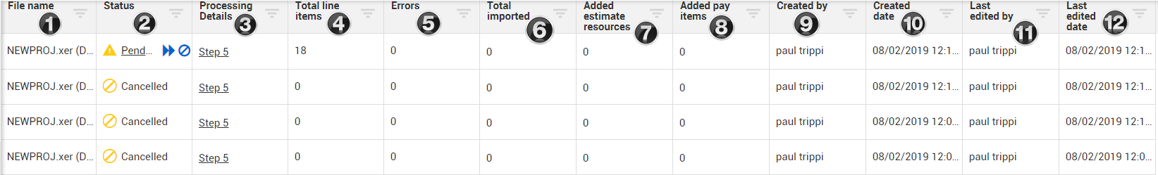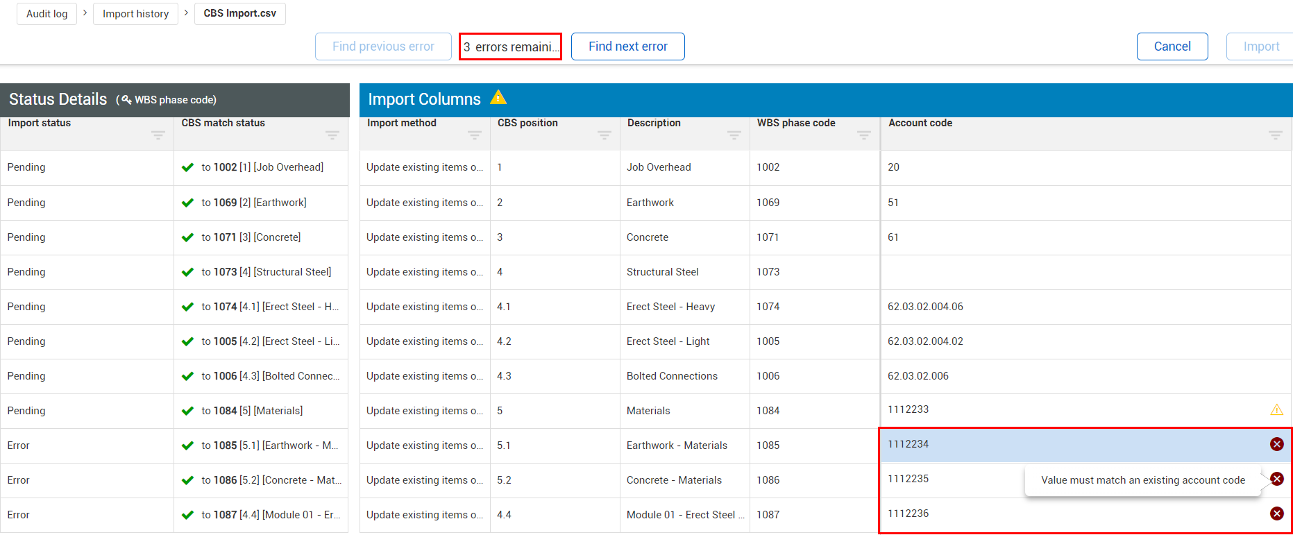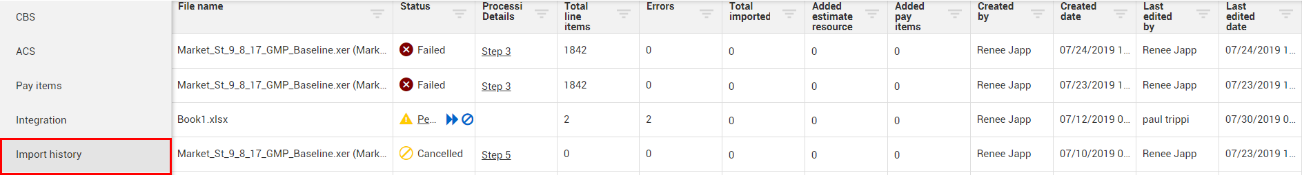 The Import history log contains status information for all imports coming into all InEight products. For example, cost item and actuals import processes can both be viewed in the Import history log for status, then you can eventually make corrections and reprocess.
