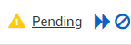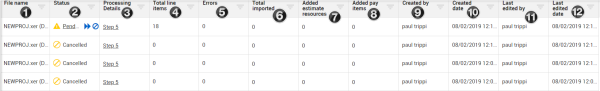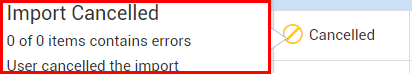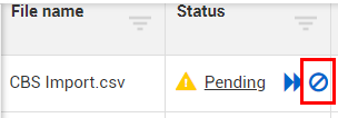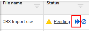 The Excel import file is pending, further action is needed. The double blue arrows will open a new window where you can correct and re-process the Excel import file. The blue circle with the line through it will cancel the import completely. |