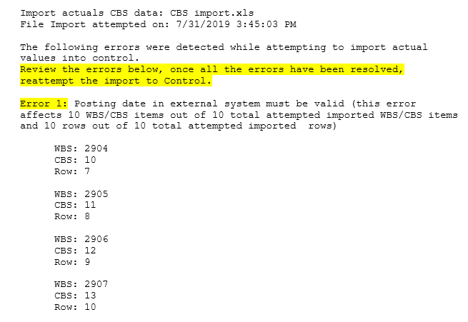 When an import is in a Failed with errors status, the system will generate a Word error report. The document displays detected errors while attempting to import the Excel file values. Errors will need to be reviewed within the Word document