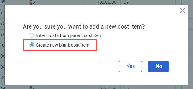 2. Select Create a new blank cost item, and then click Yes.