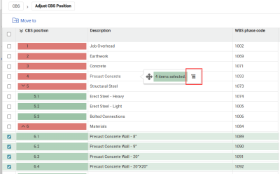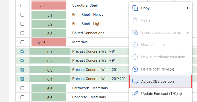 2. Right-click the cost item(s) to open the cost item menu, and then select Adjust CBS position.