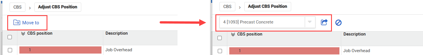 • If you prefer not to use drag and drop, click the Move to icon. Input the applicable CBS position, and then click Move to again. Select Child to move the cost item(s) into a subordinate position, or Sibling to move the cost item(s) to an equal position.