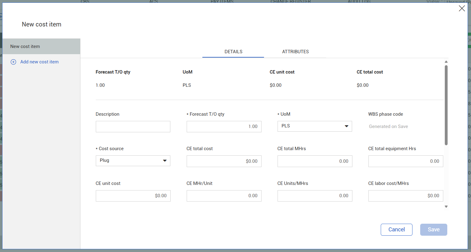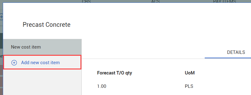 • New Cost Item: Creates a new cost item at the same hierarchy level as the selected item, using the next available number. For example, if you select 1.6, the new item will be 1.7 (if available).