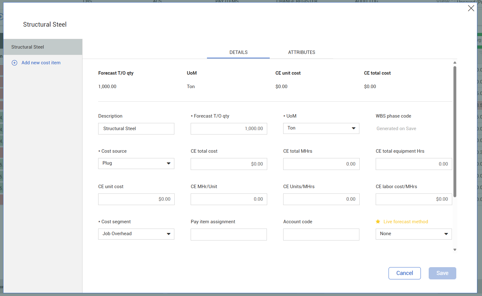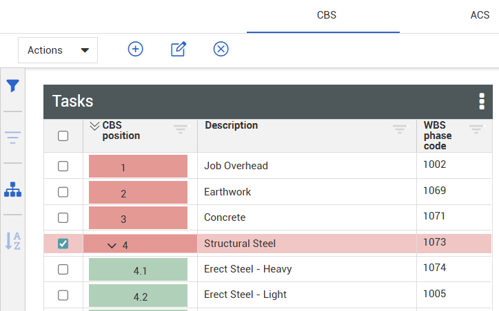 While most of your project structure typically imports from your estimating system, you may need to adjust the Cost Breakdown Structure (CBS) to better reflect how the work will be executed in the field. Additionally, contract changes or newly added scope may require updates. To accommodate these needs, you can add, edit, and rearrange cost items as necessary.
