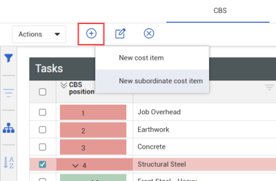 • To specify the CBS position of the new cost item, first select an existing cost item from the CBS, and then click Add Cost Item > New cost item.