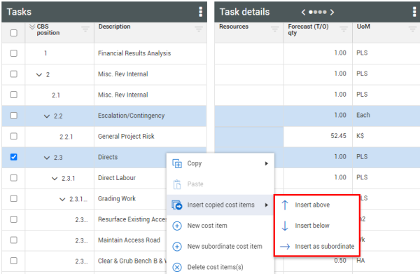 5. Hover over the option Insert copied cost items. You have three options as to where to place the copied cost items: