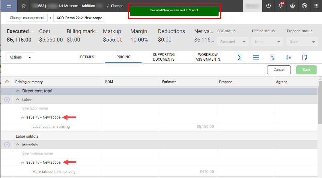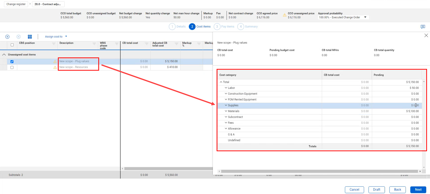 You can also create cost items with resources in Change, and then have them created in Control upon the approval of a contract adjustment. This reduces the amount of extra steps needed for creating cost items in multiple areas.