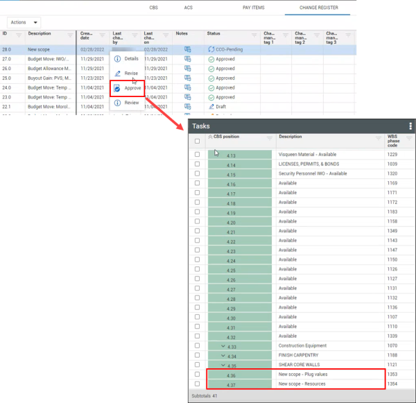 Approving the change order creates the new cost items with the resources specified in Change, and places them within the hierarchy specified in the contract adjustment, and if none is specified, then they are placed at the bottom of the CBS.
