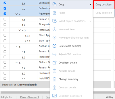 3. Hover over the Copy selection and select Copy cost item.