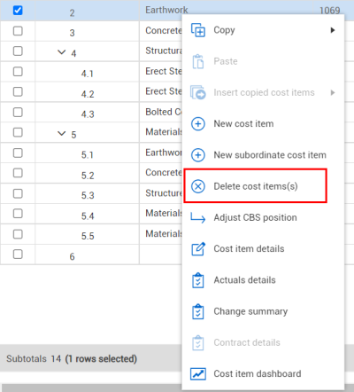 You can also select a cost item and click the Delete icon on the left toolbar.