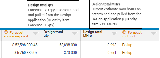 Control displays the sum of the Forecast T/O quantity from the associated InEight Design items against the attributed cost items. You can compare the Design total quantity and Design total man-hours to the Forecast (T/O) quantity and Forecast hours columns, to make sure the values match up with what is in Design.