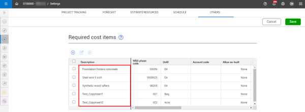 When required cost items are added in Settings > Control > Others > Required cost items, the feature provides standardization across all projects for those cost items that are commonly used.