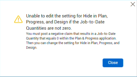 When the job-to-date quantities, costs, or man-hours are not zero, and you elect to hide the cost item, a message shows indicating that you cannot edit the setting, as shown in the following example.