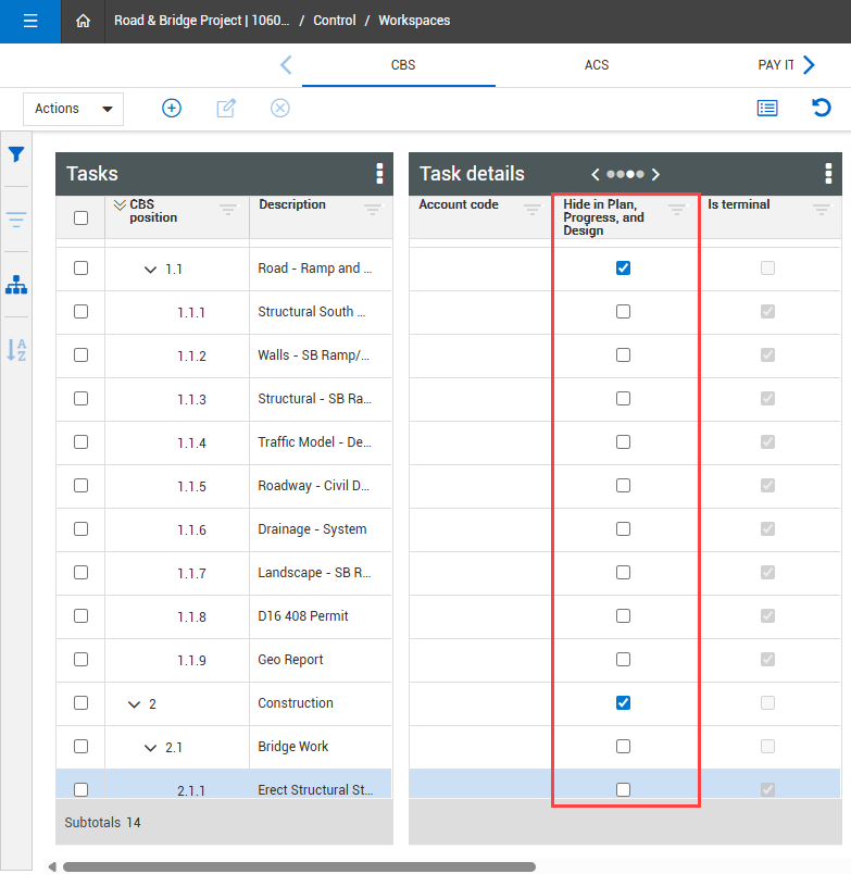 On the CBS tab in the CBS Task details block, you can select the check box for the cost item to hide it in the Plan, Progress, and Design applications.