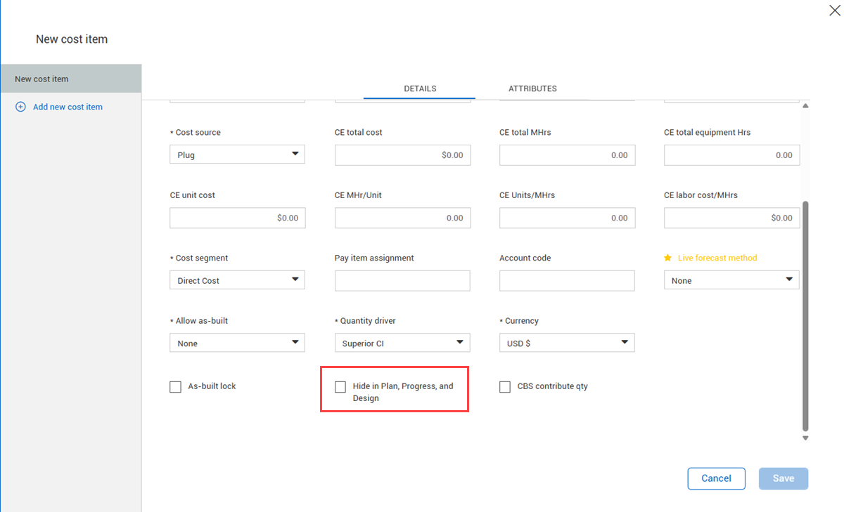 The hide feature drives whether the cost item shows in Plan, Progress and Design. When the hide feature is not selected, the cost item shows in Plan, Progress, and Design. Those applications use the Allow as-built and the As-built lock to determine which type of actuals can be claimed (cost, quantity, man hours, equipment hours) or whether the cost item should not have actuals.
