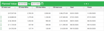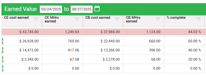 CE cost earned CE MHrs earned CB cost earned CB MHrs earned |
