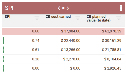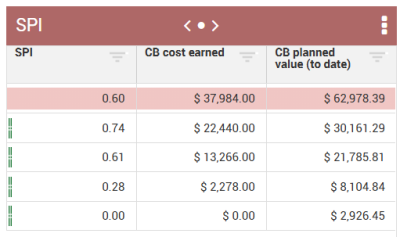 Schedule performance index (SPI) measures how close the work is being completed according to the designated schedule. It is uses the formula CB cost earned ÷ CB planned value (to date).