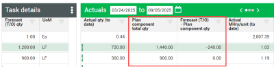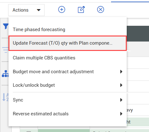 To align the forecast with the planned scope, use the Update Forecast (T/O) qty with Plan component total qty option under the Actions drop-down menu. This copies the Plan quantity directly into the Forecast (T/O) qty field.