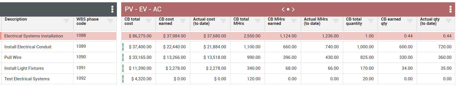 The following displays planned vs. earned vs. actual values within a custom data block of the CBS register of InEight Control: