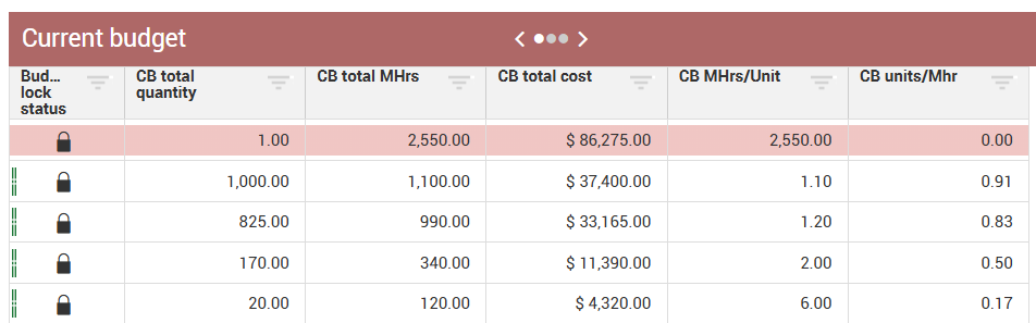 In the CBS register, you can access the Current budget data block and view CB values for planned, earned and forecasted costs, hours, and productivity.
