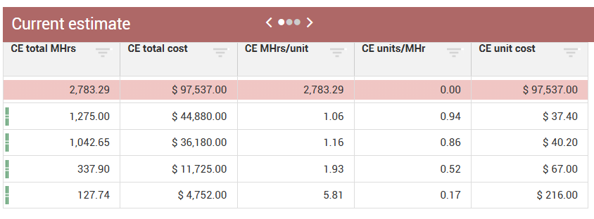 The current estimate (CE) represents the most up-to-date estimate of your work. You can update your current estimate quantities, hours, and costs at any time in the CBS register, with no required approval process or workflow.