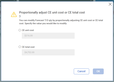 When you update the Forecast (T/O) qty, you are prompted to update either the CE unit cost or CE total cost. You can also choose to update either the CE labor cost/Mhr or CE total MHrs, and either CE construction equipment cost/hr or CE total equipment hrs (if applicable).
