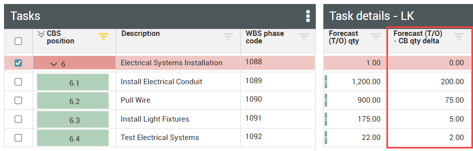 The Forecast (T/O) - CB qty delta column shows you the difference between the Forecast (T/O) quantity and the current budget total quantity columns.