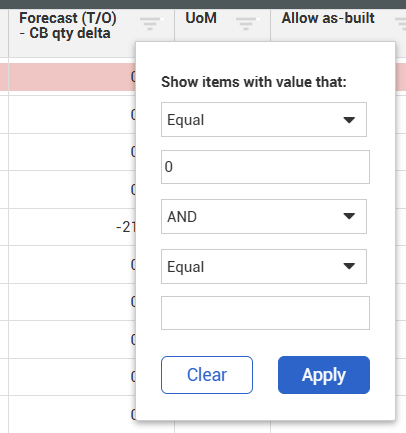 You can filter for cost items with a delta greater than 0 when you want to align the Forecast T/O Quantity and CB total quantity.