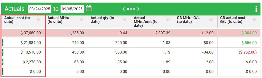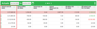 CE actual cost G/L (to date) CE MHrs G/L (to date) CB actual cost G/L (to date) CB MHrs G/L (to date) |
