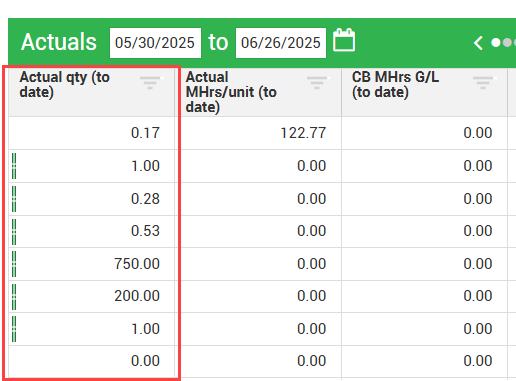 A quantities sync lets you to bring actuals from other InEight applications into Control. Quantities are brought into Control through a Get Quantities sync. The Actual qty (to date) column is updated when the sync is complete.