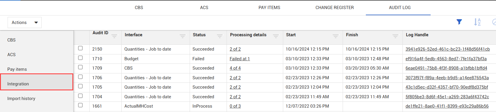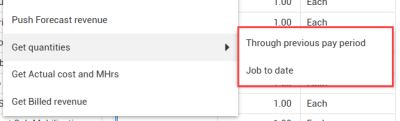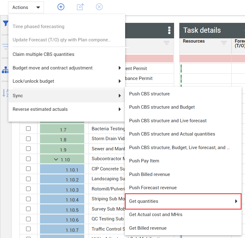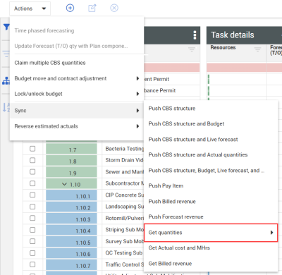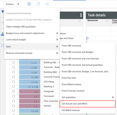 After man-hours and costs are verified in your ERP system, you can initiate a sync to bring those values into Control. Similar to the Get Quantities sync, the Get Actual Cost and MHrs sync is accessed from the Actions menu.