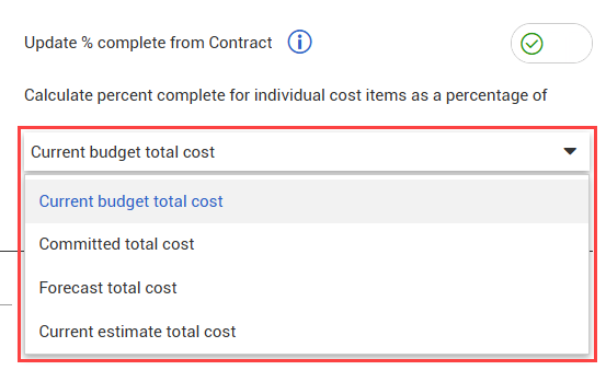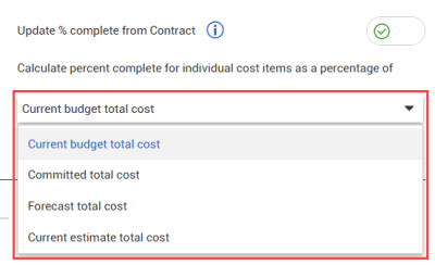 After the Update % complete from Contract setting is enabled, select from the Calculate percent complete for individual cost items as a percentage of drop-down list to define how you want to calculate the percent complete for cost items.