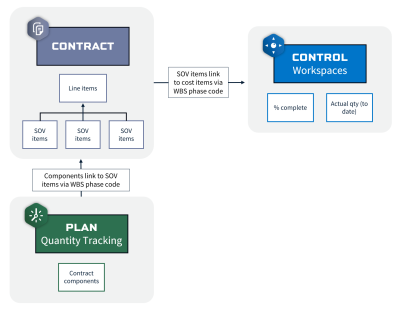 Quantities from InEight Contract represent completed progress associated with a third-party contract. Contract line items can be broken down into schedule of value items to track field progress. These SOV items can be claimed directly in InEight Contract, or they can be claimed as contract components in InEight Plan. SOV items are linked to cost items through the WBS phase code. As a result of a Get Quantities sync, SOV quantities update the percent complete and actual quantity for their associated cost items.