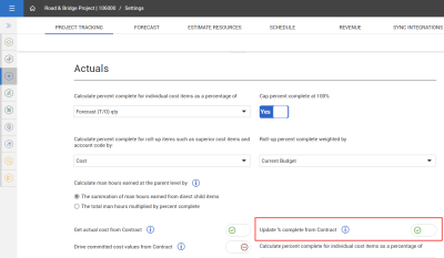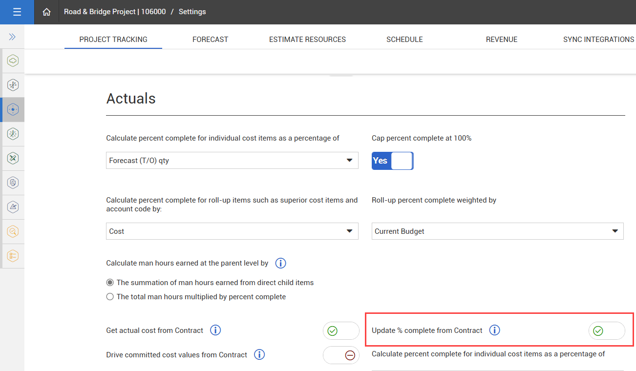 To update complete from InEight Contract, you must enable the settings for the project in Control > Project Tracking > Actuals. Switch the Update % complete from Contract toggle to On.