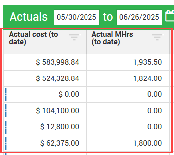 If your project uses external systems to capture man-hours and costs, those values can be brought into Control through a sync. If your project uses an ERP system, you can bring in man-hours and costs by performing a Get Actual Cost and MHrs sync. If you have values tracked through contracts, you can enable project settings to bring those values in from InEight Contract. Hours and costs brought into Control through a sync update which updates the Actual cost (to date) and Actual MHrs (to date) columns.