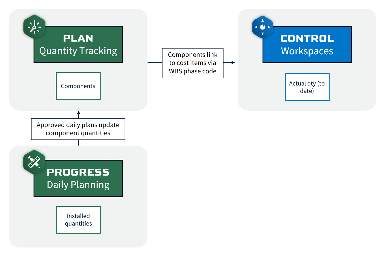Quantities from InEight Plan represent completed progress in the field. Quantities can be captured directly in the Quantity Tracking module, or they can be captured through approved daily plans from InEight Progress. Components are linked to cost items through the WBS phase code. As a result of a Get Quantities sync, component quantities update the actual quantity for their associated cost items.