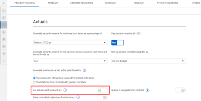 In project settings, under Control > Project Tracking > Actuals, switch the Get actual cost from Contract toggle to On.