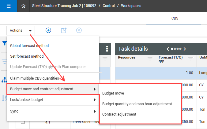 Budget move Reallocate costs from one area of the budget to another. When making a budget move, the result must be net zero, neither adding nor removing costs from the budget. The move can include reallocation of man-hours and quantities as well.
