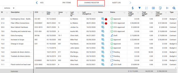 After you fill out and save the applicable changes, Control stores these changes in the Change Register tab, where the project budget is managed.