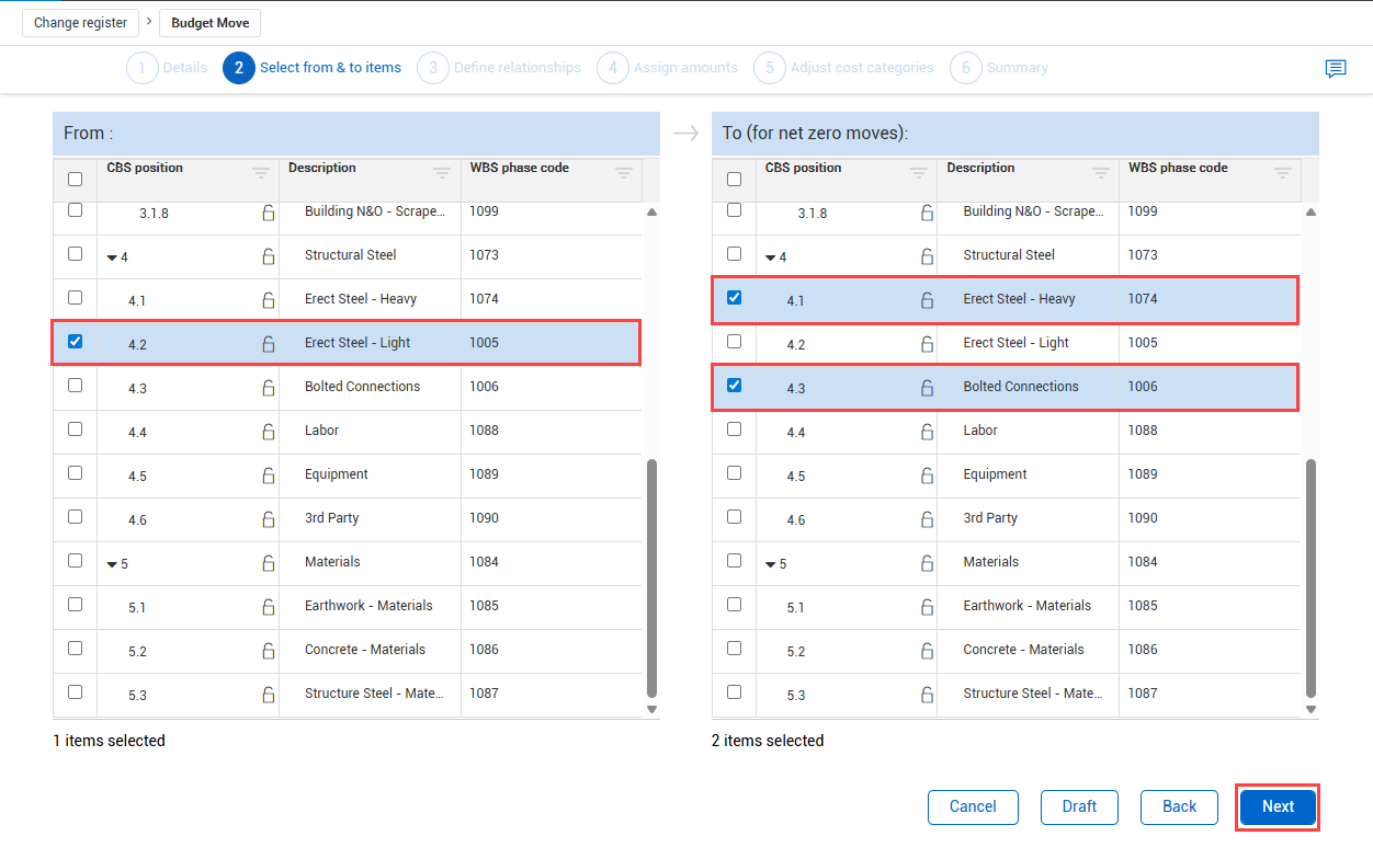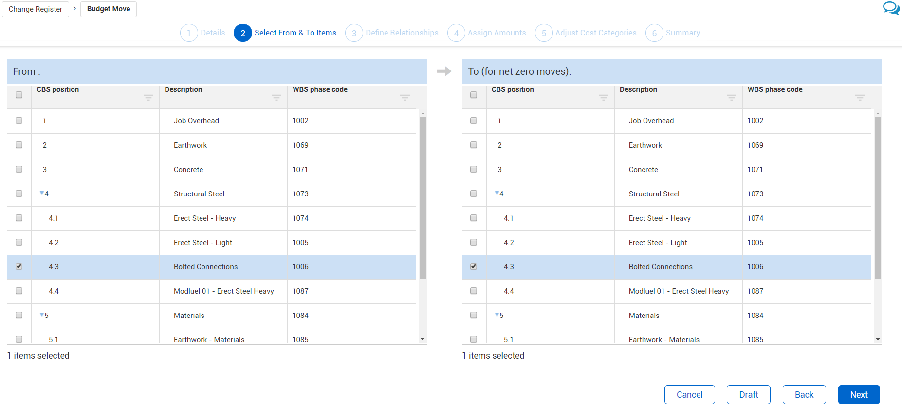 From the From section on the left, select the cost items you need to move budget from and from the To (for net zero moves) section on the right, select the cost items you need to move budget to.