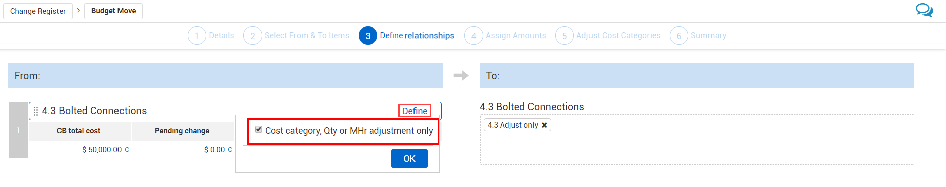 In Define relationships, click the Define button, and then select Cost category, Qty, or MHr adjustment only.