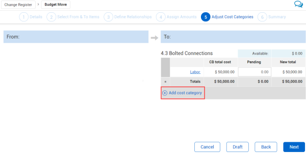 Click Next. The Budget move wizard opens to step 5, Adjust cost categories.