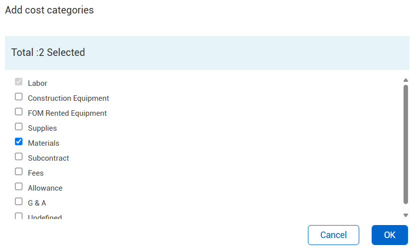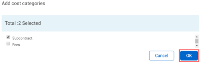 On the Add cost categories window, select the cost categories to include in the adjustment, and then click OK.