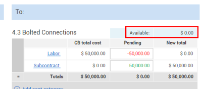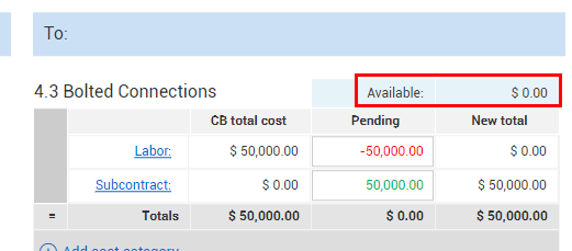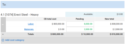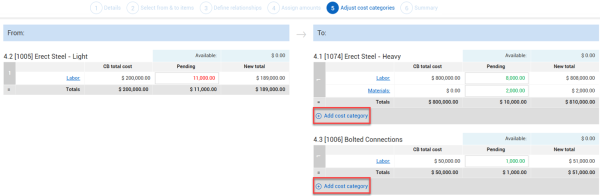 In Adjust cost categories, you can assign your pending budget changes to existing and new cost categories of your cost item. For each cost item under the To section, click the Add cost category button to reassign costs to different cost categories.