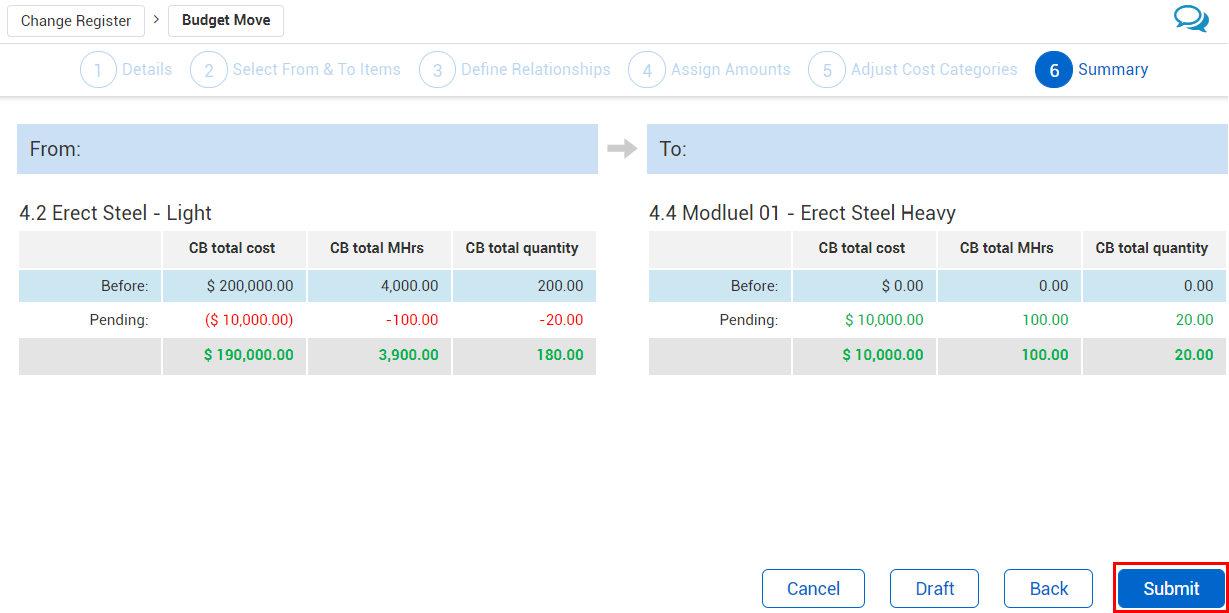 In Summary, review your proposed changes, and then click Submit to send the budget move for approval.