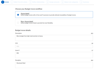 In Details, select the Associatedoption and add budget move details as needed, and then click Next.