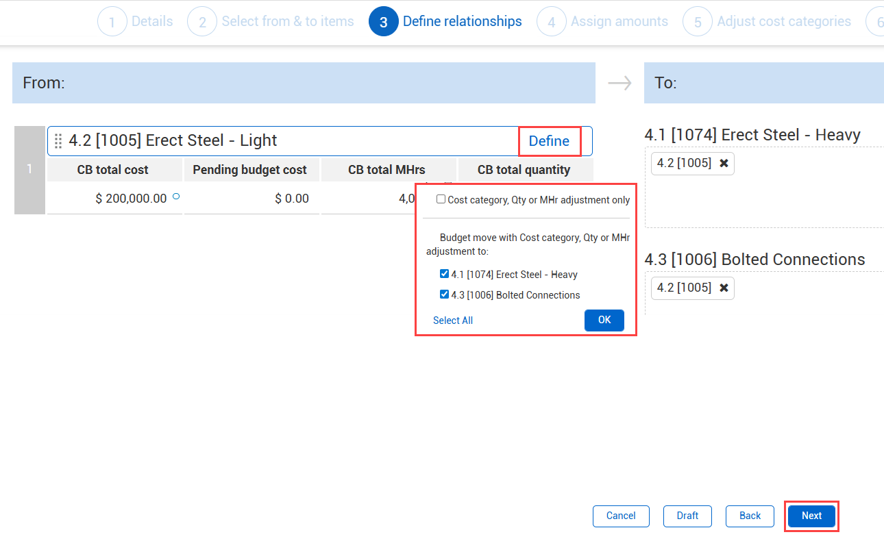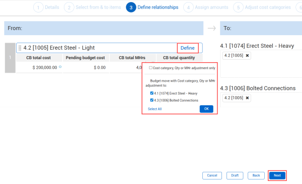 Click Next. The Budget move wizard opens to step 3, Define relationships.