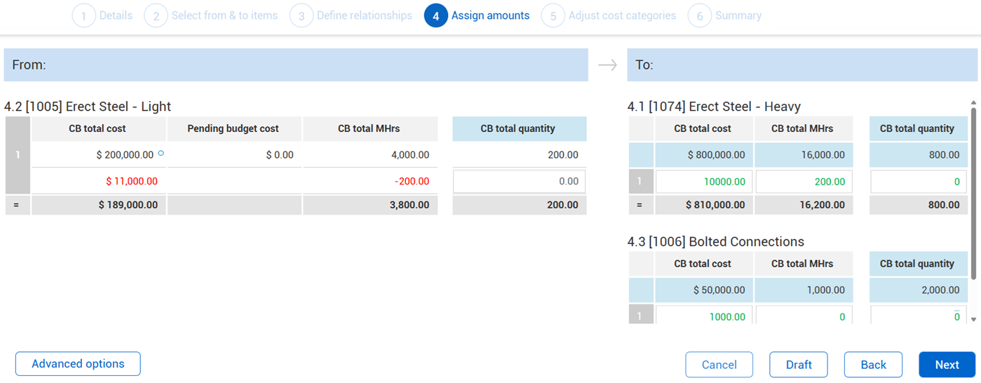 You may need to add more or fewer man-hours than you deduct. To allow this, select Advanced options and switch the Adjust MHrs (not net zero) to On. The CB total MHrs of your From cost items will no longer automatically deduct when you make adjustments to your To cost items.